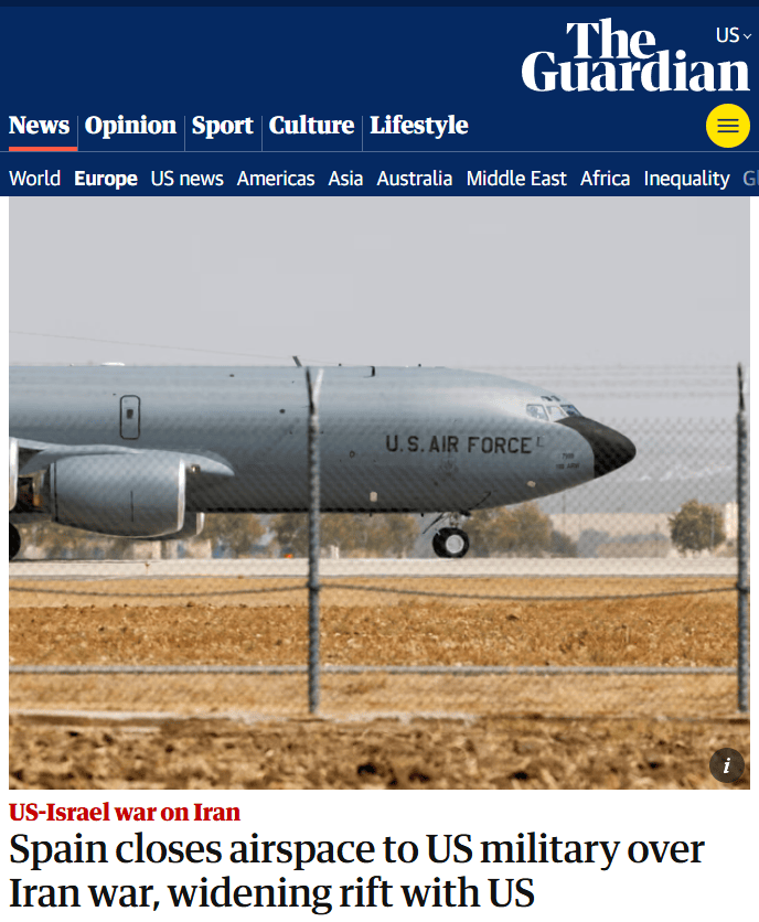 英国《卫报》30日的报道认为,西班牙加大了对美以对伊朗战争的反对力度,对参与袭击的美国军机关闭领空,突显了西班牙作为欧洲主要批评国的立场。