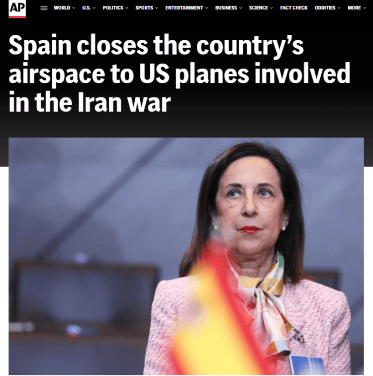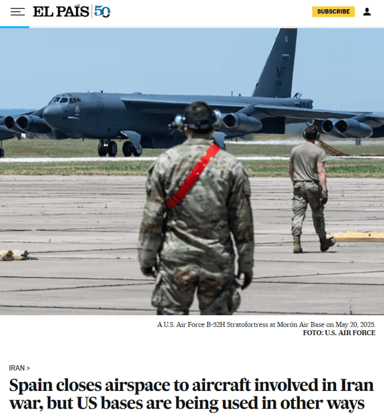 西班牙反对非法战争的又一步 美军机跨越欧洲袭击伊朗更困难