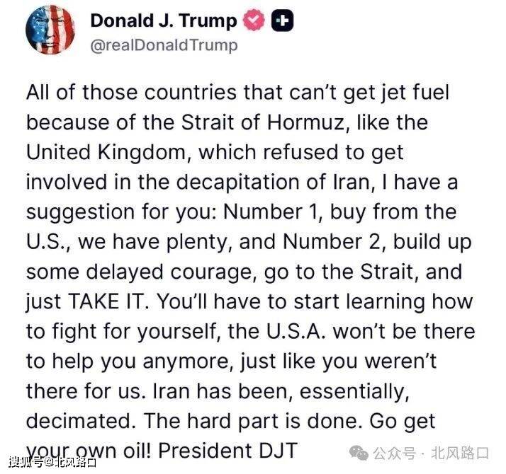特朗普愤怒表示:“所有那些因为霍尔木兹海峡而无法获得航空燃油的国家,比如拒绝参与‘斩首’伊朗行动的英国,我给你们一个建议:第一,从美国购买,我们供应充足;第二,鼓起勇气,前往海峡,夺取燃油。”