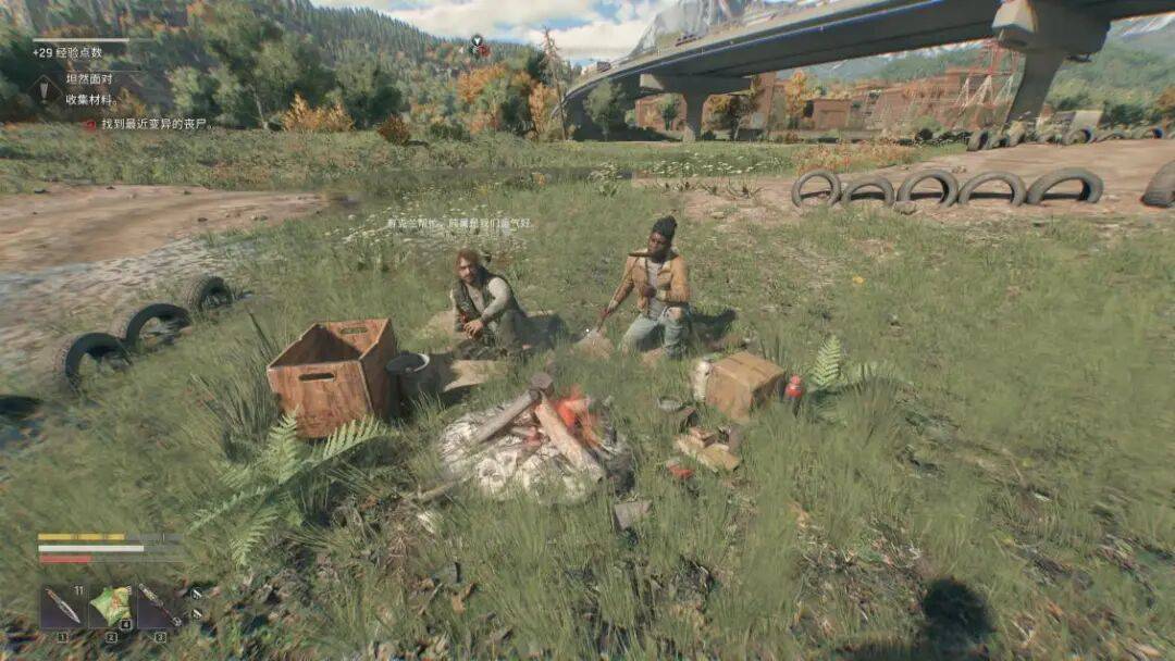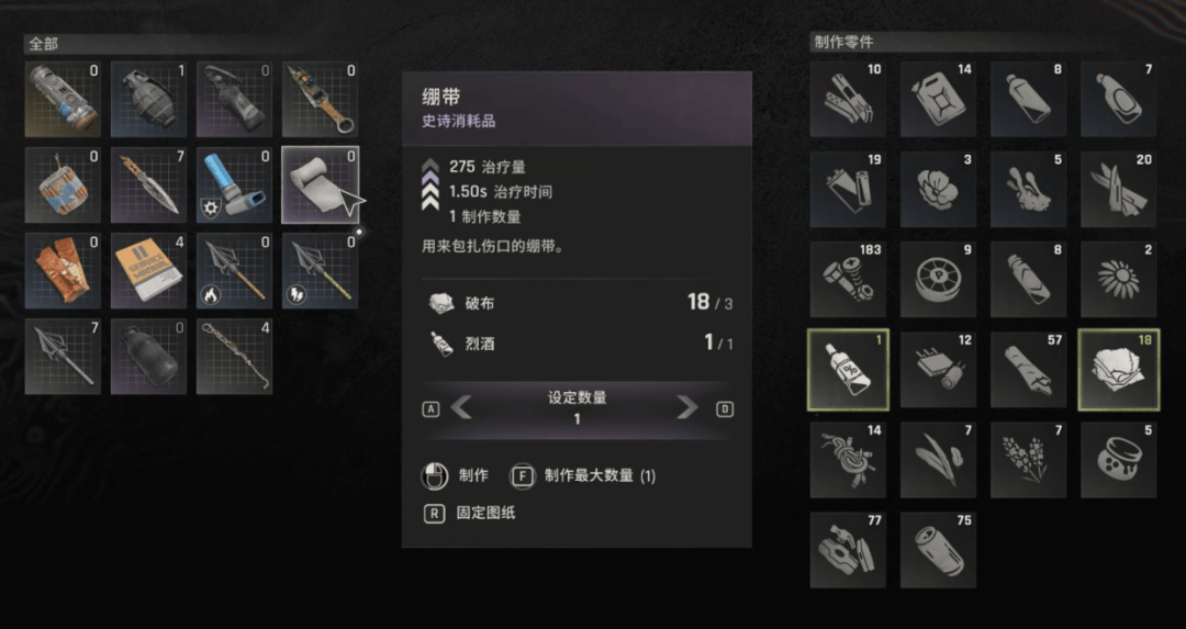 在穷得直呲牙的前3-4个小时,我为普通模式下随处可见的烈酒(能搓绷带和燃烧瓶)、线材(能搓飞刀)、羽毛(能搓弓箭)等基础资源疲于奔命。有时我不得不用赤手空拳跟丧尸搏斗,因为一旦把手头的武器砸坏了,短时间内还捡不到能用的武器。