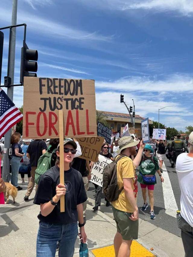 洛杉矶约10万民众在市中心举行抗议活动。抗议者挥舞着美国国旗,手持标语牌,批评特朗普政府当前执行的移民政策、经济政策、对外政策以及非法扩展行政权力的行为。59岁的抗议者比利·布朗接受记者采访时说:“曾经,这是一个让我们所有人都引以为傲的国家。而如今,我们已沦为全世界的笑柄。”