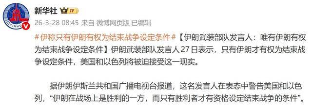 3月28日,@新华社:伊朗武装部队发言人27日表示,只有伊朗才有权为结束战争设定条件,美国和以色列将被迫接受这一现实。