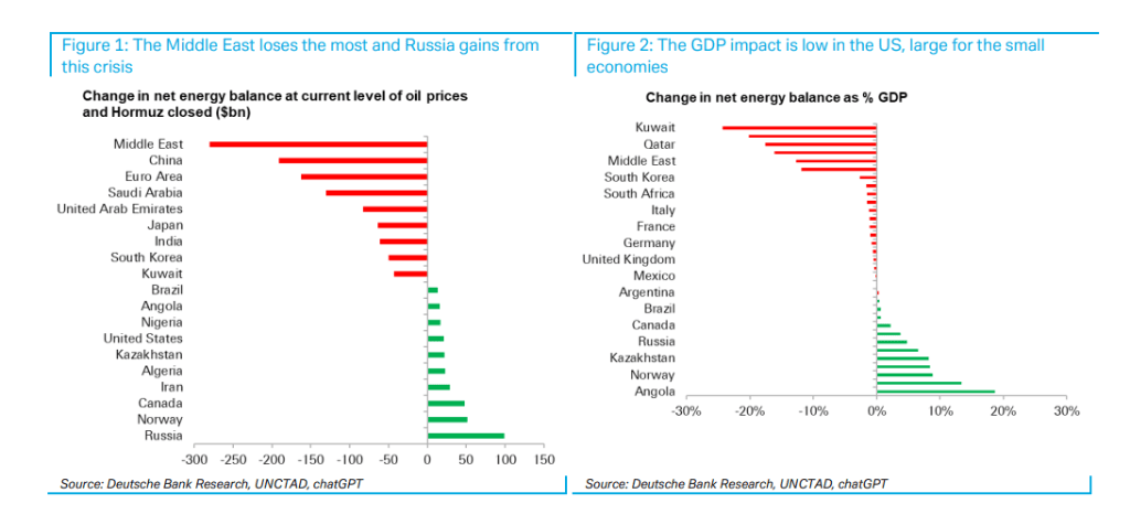 据追风交易台消息,德意志银行外汇研究主管George Saravelos于3月30日发布研究报告,从国际收支角度量化分析伊朗战争对全球各经济体外部账户的冲击。报告得出三个核心结论:中东是最大输家,美国财富在内部转移而非净增,俄罗斯是最大赢家。